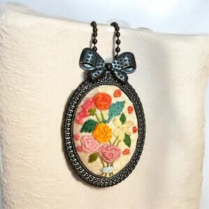 Bright Botanical Embroidery Necklace, Handmade Floral Cameo