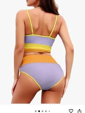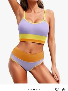 Vibrant two-piece swimsuit. Lavender main panels with bold orange and sunny yellow accents. Scoop bralette top with matching high-waist bottoms. Sporty, fun summer look. Padded inserts, adjustable straps and full coverage bottoms.