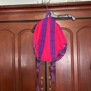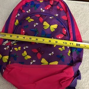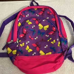 Cute butterfly backpack that has a front zipper compartment and main back zipper compartment! This has adjustable padded shoulder straps and a ring on the top to hang it from. Very cute and colorful 🥰 Inside on the front there are a couple of white spots (last pictures) but not visible from the outside and doesn’t take away from the cuteness 🥰 Normally used might have some scuffs, discoloration, marks, or stains in the lining but so much filled with additional life! If you have any questions or would like additional pictures please feel free to ask 🥰