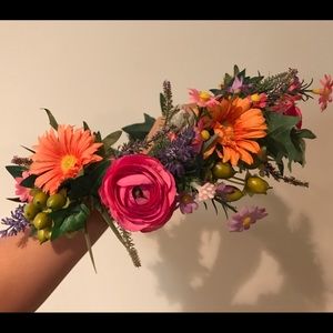 Homemade silk floral crown with flowers including, hot pink and bright orange ranunculus, orange daisies, green hypericum berries with pink and purple monte casino and lavender to accent. Crafted together to make lush and full garden style flower crown.