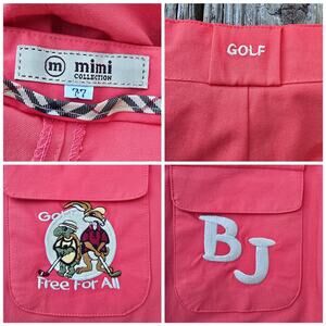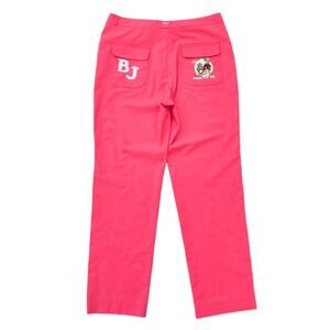 Bright coral pink stretch fabric. 2 side pockets, 2 rear pockets w/ flaps, button/zipper fly. Cropped length, small slits on legs. Embroidered back pockets: BJ on left, rabbit & turtle patch on back that says "Golf Free For All". Issues noted in photos. Very good preowned condition, overall. Label size 77: Please use measurements for fit, US size not marked. No fabric content or care labels present.
