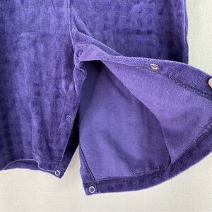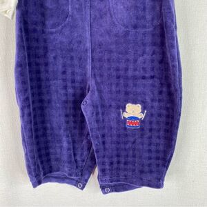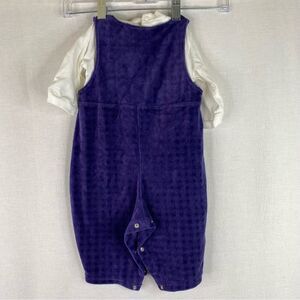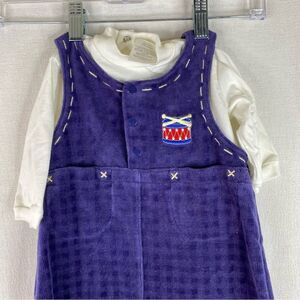 Features: Romper pants with snap buttons at the bottom, embroidery of bear and drums, white long sleeve shirt with buttons in back, velvety