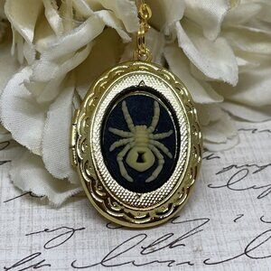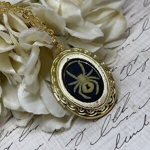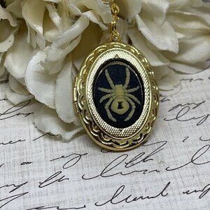 Bright Gold Cameo Black Widow Spider Locket Necklace Pendant Gothic Halloween