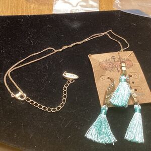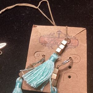 Plunder Brand Necklace and earring matching set. Adjustable gold tone chain can be worn from 16” to 18 1/2” length with the adjuster chain and lobster claw clasp, The pendant portion features 3 gold tone bricks and a soft blue tassel. Matching Pierced earrings feature Cleary crystal accents on the fish hooks and have an overall length or drop of 2 1/4”.