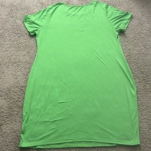 Bright Green Dress with words on the front. The words state, “Perfectly Imperfect”. Soft material with stretch and space.