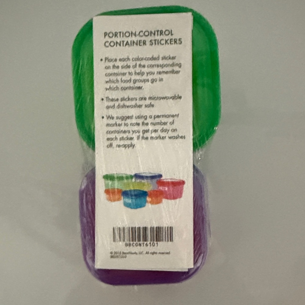 Colorful portion control stickers in green and purple. Self-adhesive labels for easy container identification. Bold, easy-to-see colors. Simple, practical organization for meal prep.