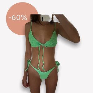 BRAND NEW. Bright green. Adjustable ties. Ruffle detail. V bottoms. Never worn. Size medium, but top runs small in my opinion. More of a “showy” bikini!