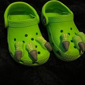 In good used condition - some dirt marks on the backs and bottoms and a little on the front. Toddler size 6 c green dinosaur/ dragon crocs.