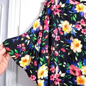 Colorful flowers against a black background that really pop! Beautiful pattern and a silky feel to this top. A ruffle at the sleeve for a fluttering feminine touch. Soft V-neck.