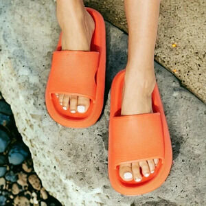 trendy slides, pool sandals, beach sandals, orange slides, comfy footwear, vacation shoes, waterproof slides, women’s sandals, casual slip-ons, open toe sandals, summer fashion, bright orange slippers, Poshmark boutique sandals, tropical style shoes, travel-ready footwear, soft sole slides, spa slippers, holiday slides, vibrant home slippers, poolside fashion, cozy slides, trendy slip sandal