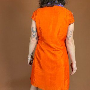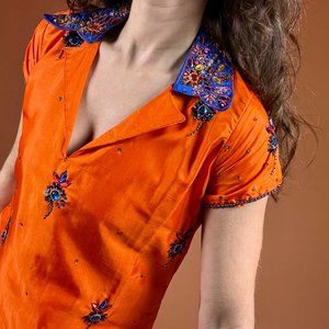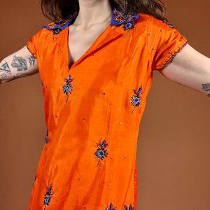 Bright Orange and Blue Short Sleeve Beaded Bedazzled Collared Tunic Dress