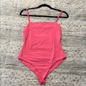 This vibrant pink bodysuit features a sleek one-piece design with thin spaghetti straps. Made from smooth stretchy fabric, it offers a comfortable fit perfect for various occasions. The simple design highlights the bold color, making it a standout piece.