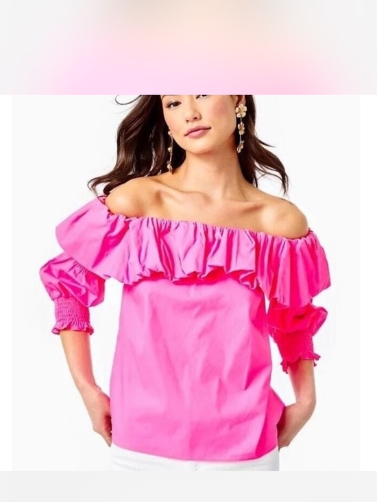Vibrant off-shoulder blouse with dramatic ruffle neckline. Three-quarter puff sleeves with smocked cuffs. Lightweight, bold pink for statement looks.