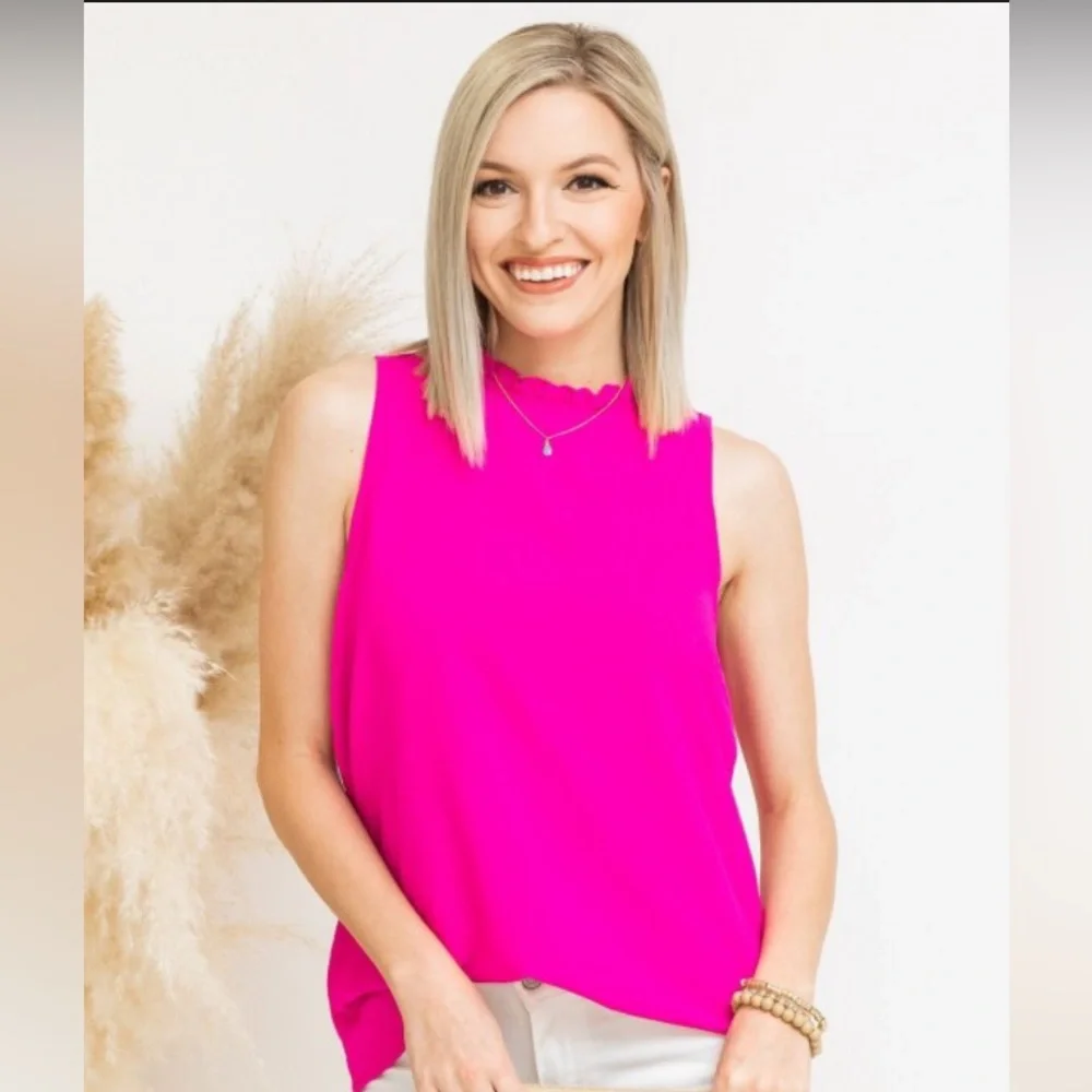 Chic sleeveless top with ruffle neckline. Bold fuchsia color. Perfect for any occasion.