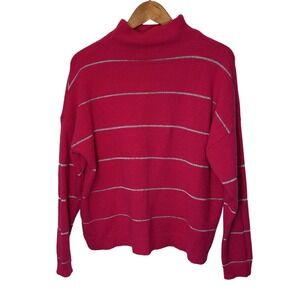 Very pretty bright pink sweater from Kim Rogers in a women's size small. Has silver metallic threads in stripes around. Mock turtleneck with a fold that goes inside the sweater and is seamed down on the sides. Good pre-owned condition with no flaws noted. Please see photos.