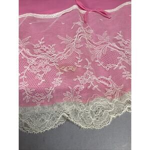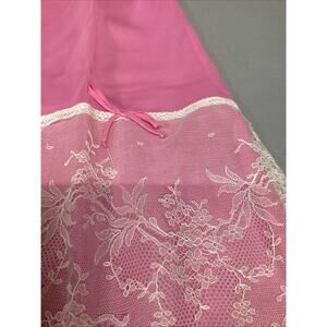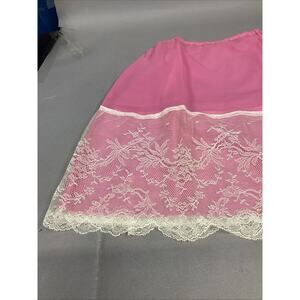 Bright Pink Slip With White Floral Lace - Medium. There is a stain in the lace which is shown in the pictures. The waist measures 10” and length is 19.5”. No inner tag and there’s a couple loose strands on the waist band.