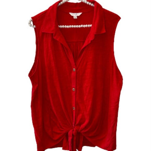 Stand out and stay cool in this bright red 100% cotton sleeveless top from Time & Tru. With a collar and button front top that ends in a front tie waist. So cute with denim shorts or any white bottoms! XL NWT