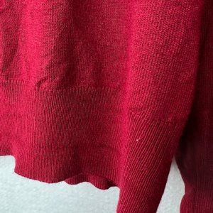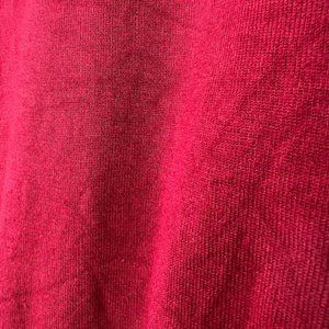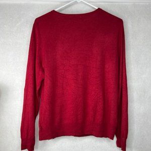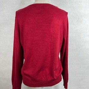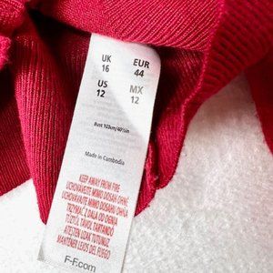 Bright red fine-knit cardigan from F&F features a tapestry pattern in the knit, 1/2-inch ribbed collar and front panel, and 2 1/4-inch ribbed hem.