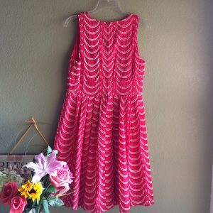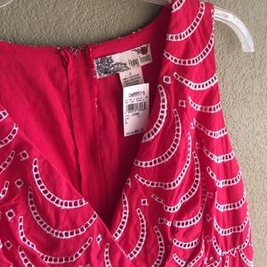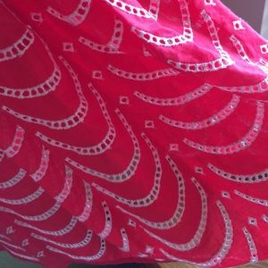 Adorable red sundress with white scalloped eyelet and embroidery detail. This saucy number will sway with you. Perfect for a street dance, festival or any other outdoor event! 100% cotton shell and lining.