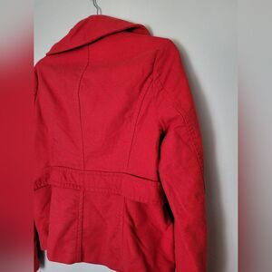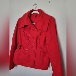 Super cute bright red trench / pea coat. Thick cotton canvas material, side epaulettes and wide lapels. Condition is excellent. Brand is Ambition. Tagged size medium measures approximately 22 inches long 17.5 inches underarm to underarm laid flat.