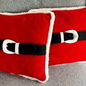 These are so festive! Two bright red pillows with Santa's belt are sure to bring a smile. Very soft and plush with white trim.