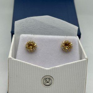 Pretty yellowish orange citrine halo earrings. alternating white and citrine stones around. Nice. Bright. 14kt gold overlaying Sterling Silver (.925). Bright and shining piece in most light.