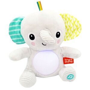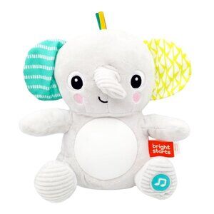 Add a sweet glow to nighttime routines and daytime play with the Hug-a-bye Baby from Bright Starts. The soft gray elephant stuffed animal plays 20+ minutes of soothing melodies and lights with a gentle squeeze of its foot. Switch between two modes of play for either continuous music or short songs. Watch as the elephants tummy twinkles in time with the tunes! Your baby will love the comforting glow of his new friends belly. Explore the many textures, crinkles and tags to encourage the development of fine motor skills. This activity toy doubles as a soother, so youll get loads of use!