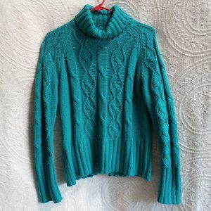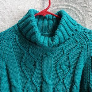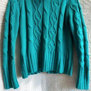 Beautiful teal color. Cable knit in front and ribbed knit at sleeves, back, neck and waist.