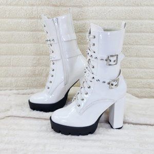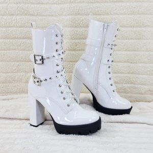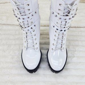 Bright White Patent Lug Sole Studded Strap Ankle Boots Temptress