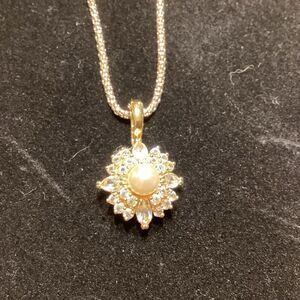 This necklace features a bright goldtone popcorn chain of 24” with a lobster claw clasp. An enhancer pendant hangs from the chain with a 1 1/2” length. It features marquise and round up cz’s in halos around a faux pearl of approx. 8mm size. Would also look gorgeous on a string of pearls and since its an enhancer it opens and has a large bail.