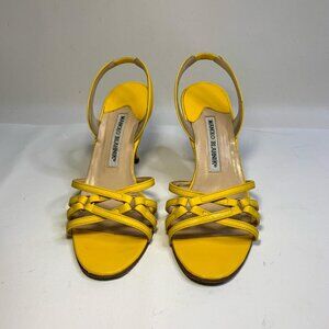Bright and bold Manolo Blahnik “Anna” slingback sandals in glossy yellow patent leather. Featuring a strappy front, open toe, and elegant high heel — the perfect statement shoe to elevate any look. Marked size 35.5.