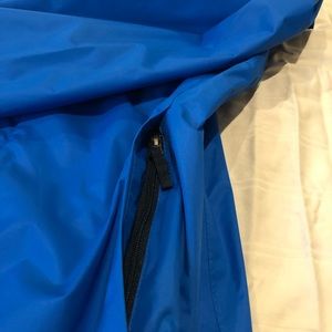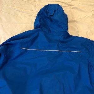 Excellent condition rain/wind shell. Quality Columbia. Has netted wicking lining to keep warm and dry. Reflective pinstripe on back and cuffs. Zippered pockets. Front zip with Velcro. Adjustable hood , cuffs, waist.