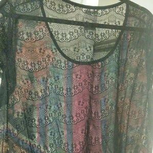Bright colors with black lace sleeves and back. Loose fitting . Took size tag off because of itching. Great used condition
