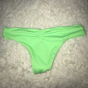 Hardly ever wore these, bought them and they were too big. Super bright green L Space color with a small scrunch in the back and minor details on each hip. Cheeky/modest coverage. Size S.
