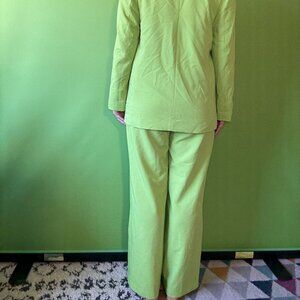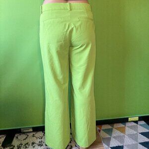 Bright neon green suit pants. Straight leg trousers. I'd say these are mid to low rise. Pretty long, I'm 5'7 and wouldn't recommend for someone shorter unless you'll wear them with heels. They are high quality and very nicely constructed, I'm just out of my bright colors era. Not sure if I ever wore them out of the house.