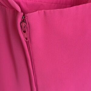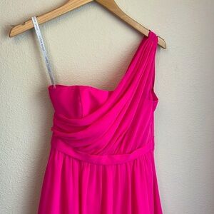 Bright pink one shoulder. Good used condition. Only worn one time. Great for prom, galas, or a bridesmaid dress. Small spot on front. See photo. Didn’t try to get it out. Not noticeable when worn