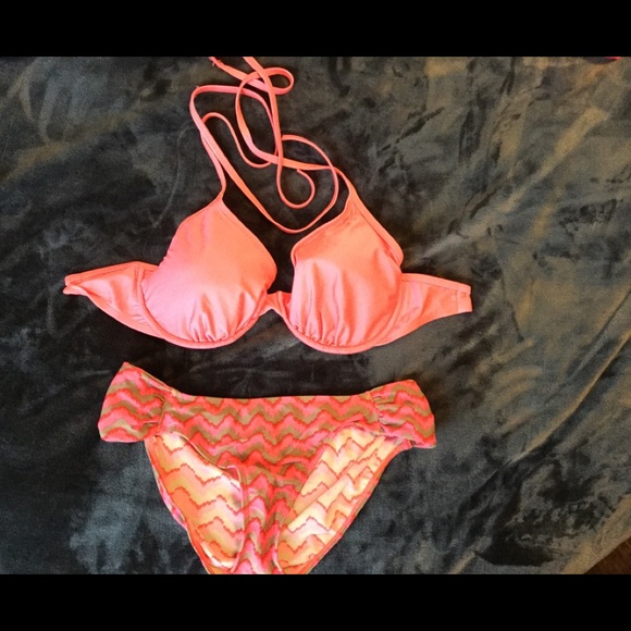 Pink swim suit with pink and brown bottoms. Super nice for a full coverage swim suit has removable pads. Ties in a criss cross on the back. Worn two times.