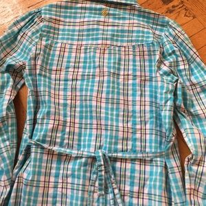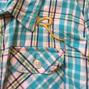 This bright and stylish button is perfect for all events. It has rhinestone detailing on the pockets and gold detailing. You can also tie it in the back to create a more tight fit.