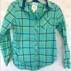 Adorable bright plaid button down! Such fun colors and comfortable material perfect for all seasons! Collar. Side pocket.