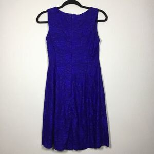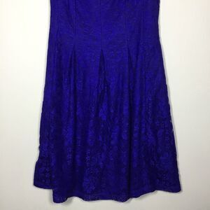 Excellent condition bright blue dress. Lace outer lined inner, see pic. Fitted top darted waist to flare. Invisible back zipper with hook and eye. AGB tag size 4P. Like new. Stretchy.