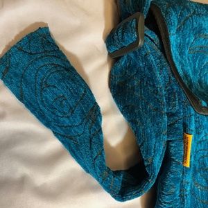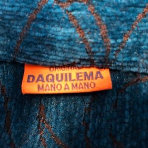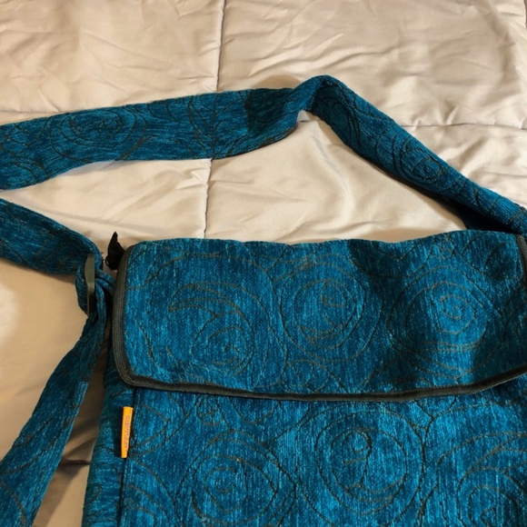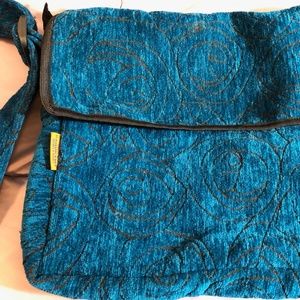 Bright teal handmade cloth shoulder bag with 2 zippers and inside pocket. Soft bag with beautiful wide strap. 14 inches wide and 11 inches high when closed. Like new. Original DAQUILEMA, MANO A MANO.