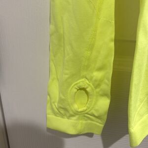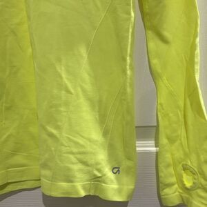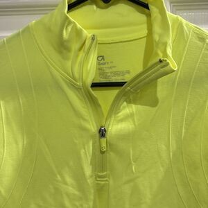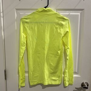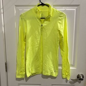Bright yellow quarter zip with long sleeves. Sleeves have a hole for the thumb. Front has a logo in the corner and also has some ribbed detailing. There is a small black mark on the back but it can probably be washed out