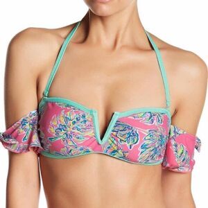 Bright Colorful Off Shoulder Bikini. Features removable strap. Bright contrasting patterned colors.