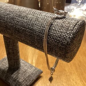 This bright silvertone bracelet/anklet is 8 1/2” in length so you can decide what it will fit for you. A beautiful toggle clasp, 3 strands of beautiful chain and a silvertone conch shell charm which contains clear cz’s inside. A well made quality piece of fashion jewelry.