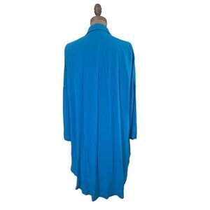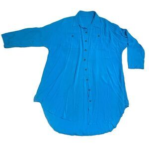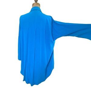 Bright Turquoise Rayon 1/2 sleeve button down Overshirt, tunic, beach cover-up, size OSFM. Lovely lightweight shimmery soft fabric. In excellent condition