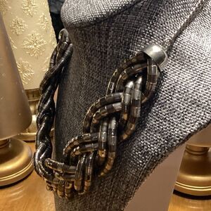 A gorgeous choker necklace of 6 strands of matte finished and shiny finished beads on this adjustable length necklace. Bright silvertone endcaps leads to a silvertone chain with a large lobster claw clasp. It can be work from 18” to 21”.