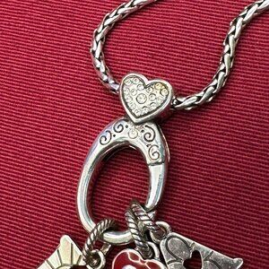 Brighton ABC hook style charm necklace with red heart charm and “A” and “H” initial charms. Heart charm features crystals on one side, and Brighton “B” engraved on the other side. Wheat chain measures 16-18” adjustable with extender, and features the iconic Brighton “B” puffy heart charm and Brighton heart-shaped lobster claw closure. Charms can be easily added and removed for different looks/seasons. In good pre-owned condition.