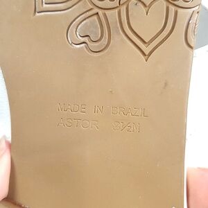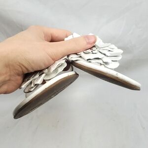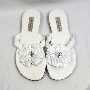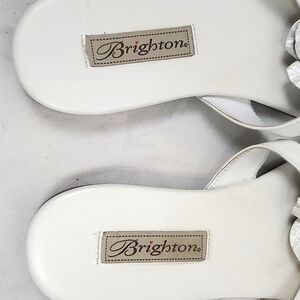 Brighton Astor white leather thong sandals. 3D leather flower attached to straps. Good condition, very minor scuffing on front of toes. Size 8.5.