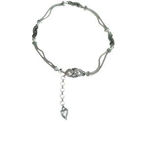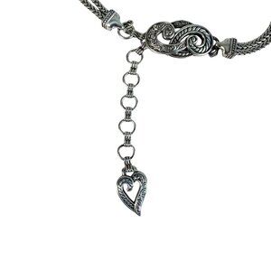 Features Brighton’s signature ornate scrollwork links, braided double chain detail, and a dangling open-heart charm. Adjustable hook closure allows for versatile fit (approx. 34" to last adjustment ring).