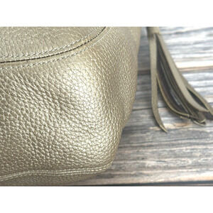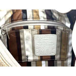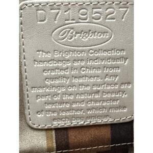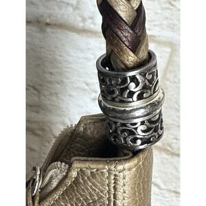 Elevate your style with this stunning Brighton "Barbados" hobo shoulder bag. Crafted from metallic gold leather with a pebbled finish, this medium-sized bag features a braided strap and a zipper closure. The bag width is 13 inches, the bag height was 9 inches, and the bag depth was 3.5 inches. The lining material is fabric with a multicolor pattern, and the lining color is multicolor. The handle style is a shoulder strap with a silver hardware color. The bag comes with a key holder and a bag charm (Some of the Silver Coloring has come off) . The Brighton Barbados model is a very popular handbag for woman who wants to add a touch of elegance to her wardrobe. This bag is perfect for any occasion. Please review all pics carefully and let me know if you have any questions. All items come from a smoke and pet free home.